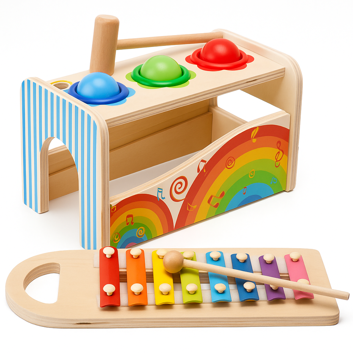 Este juego 2 en 1 invita al niño a desarrollar curiosidad, ritmo y coordinación en una sola experiencia educativa.