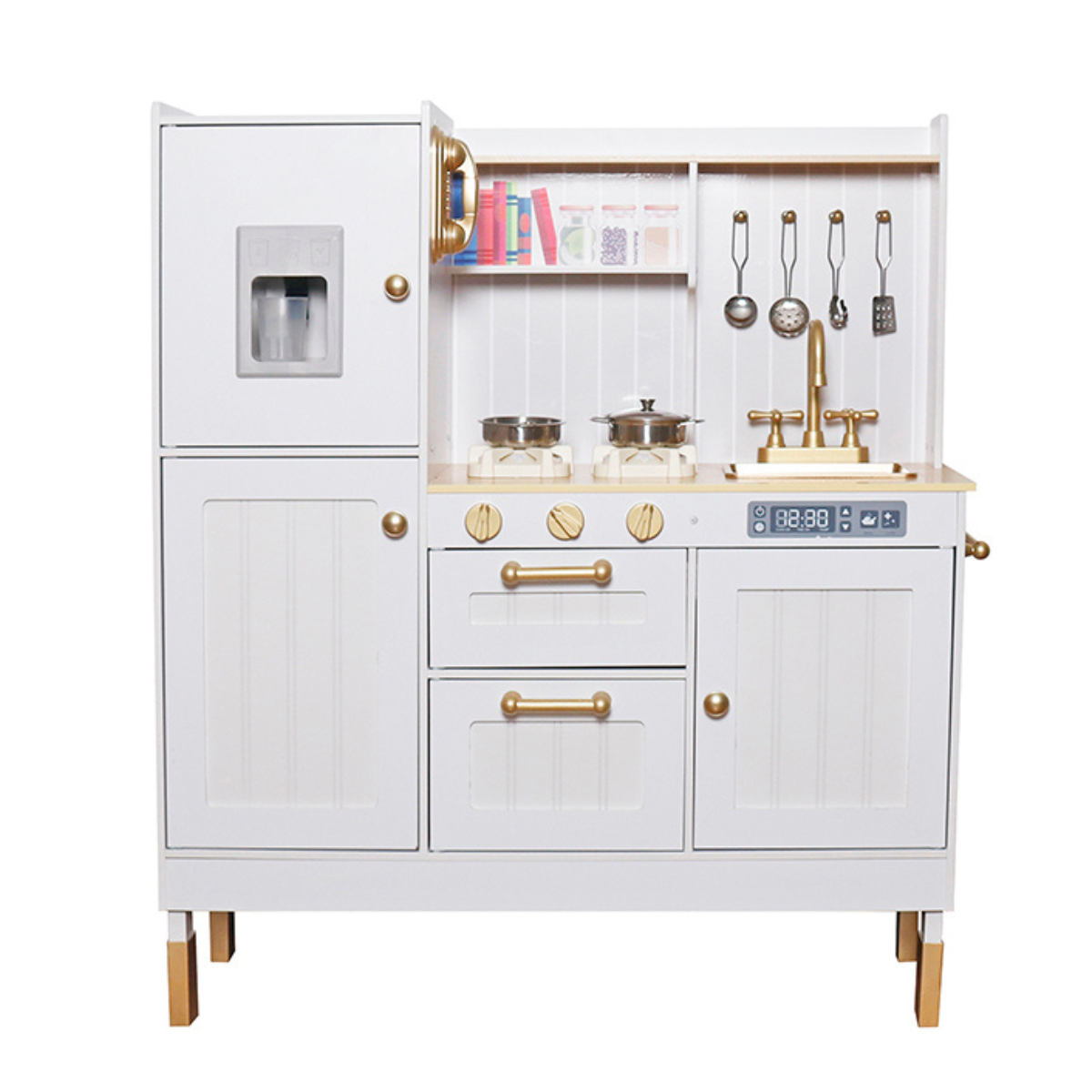 Incorpora refrigerador con dispensador de hielo, estufas eléctricas con luz y sonido, grifería dorada, repisas organizadoras y accesorios que enriquecen la interacción.